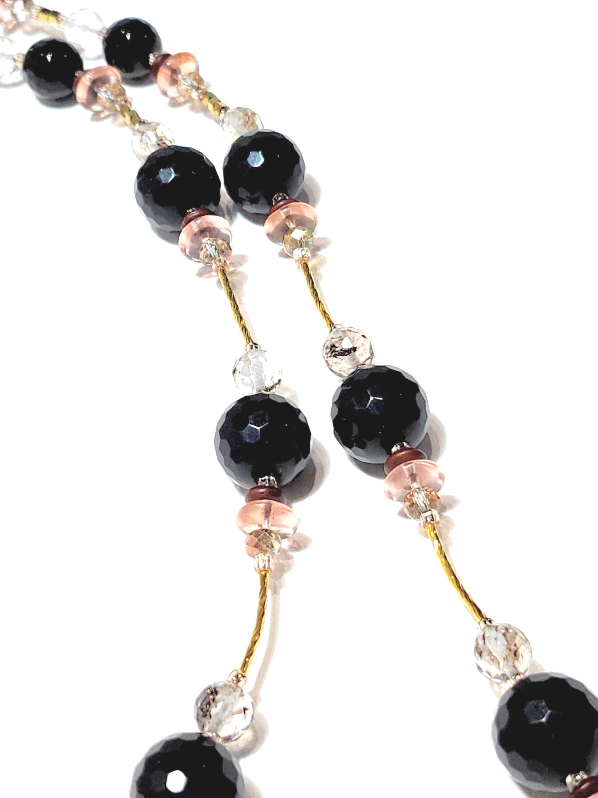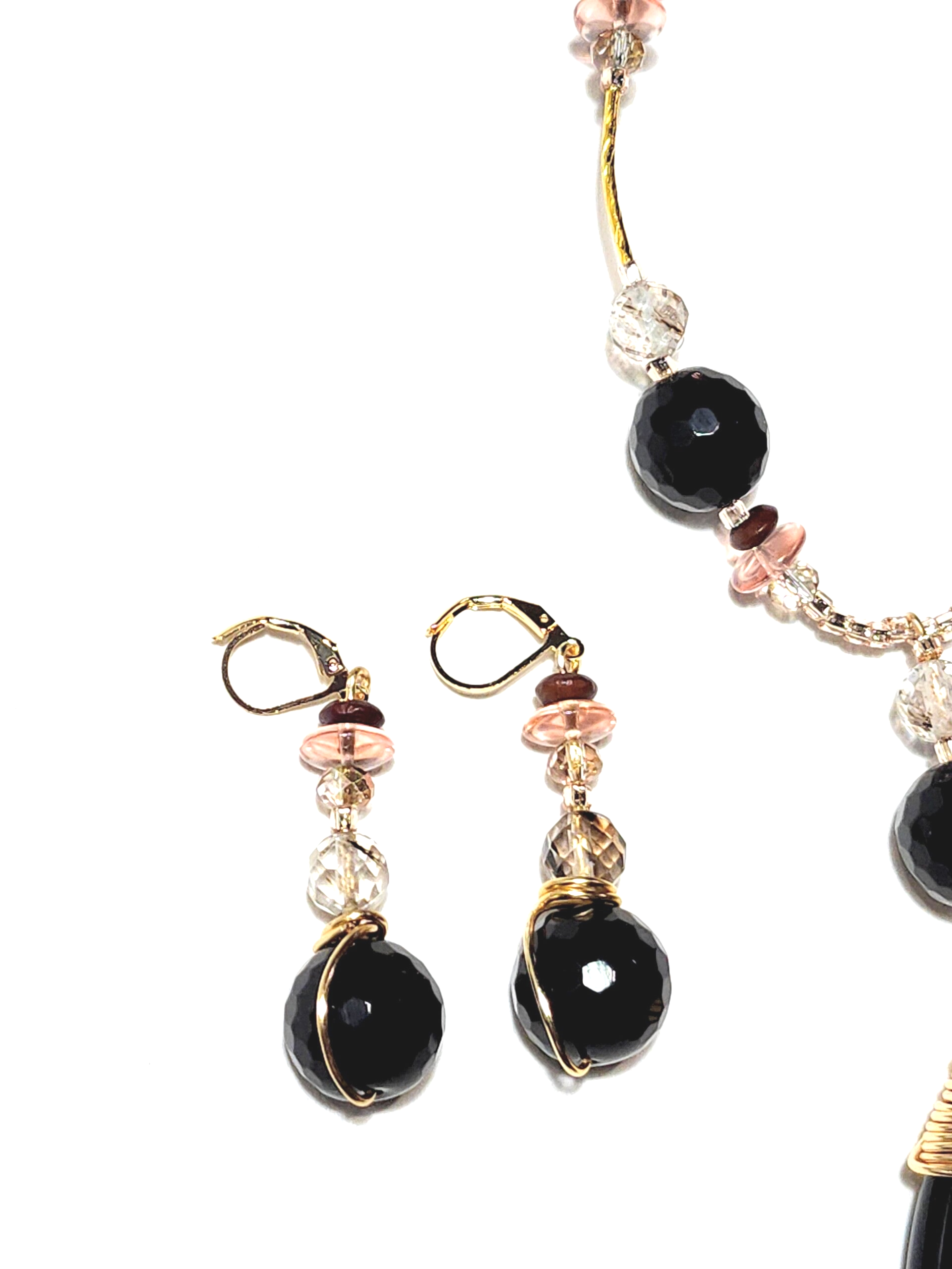 Material:Gemstone: Agate, black onyx, gold tone hematite, clear quartz, shell Glass: Pink glass bead, rose gold tone glass, electroplated clear & rose gold tone glass beads. Metal: Clasp, earring closures, spacer beads, findings, wire wrapping, wire, Wood: Spacer beads