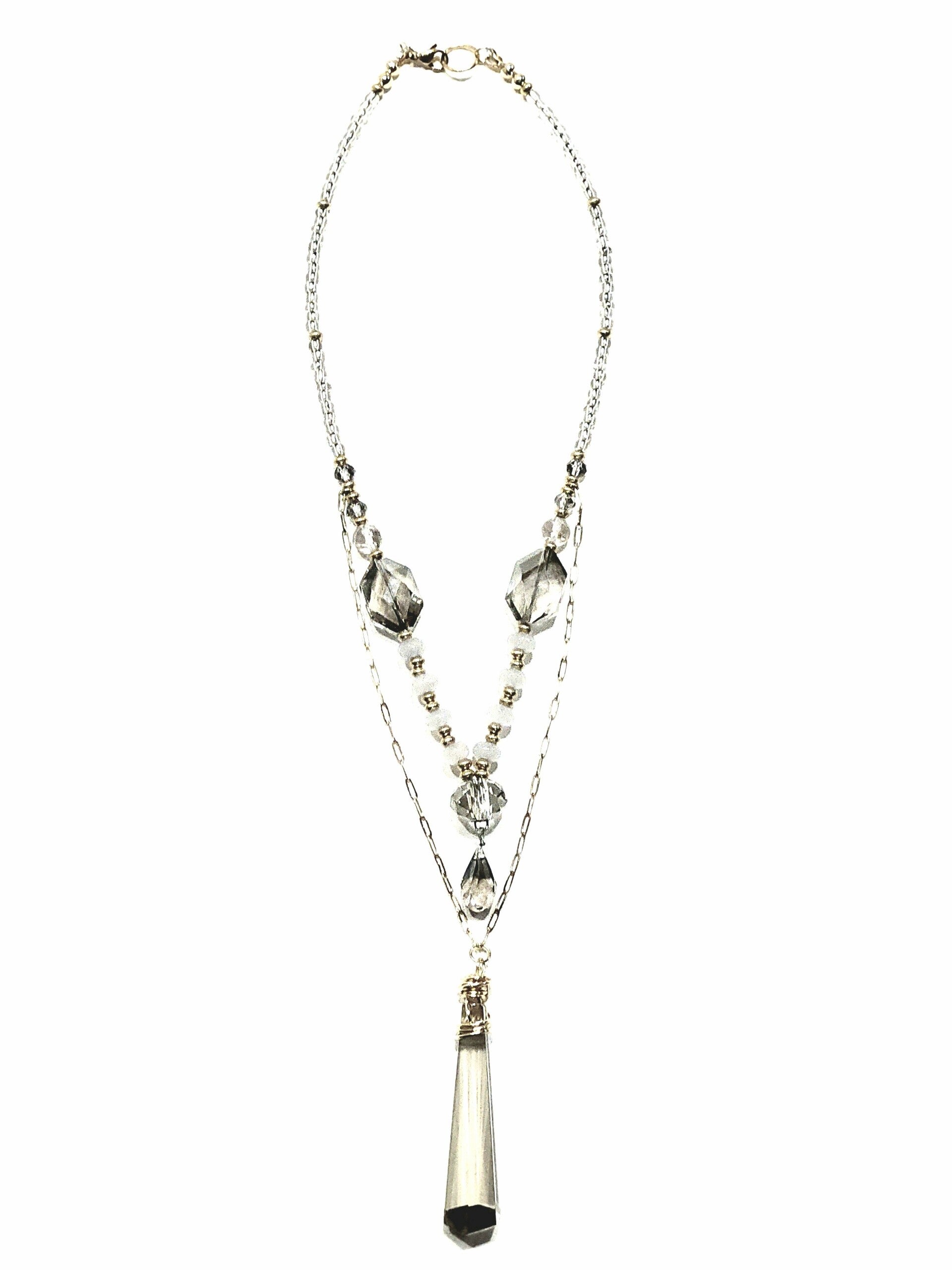 Material: Gemstone: Grey faceted rondelle jade, clear quartz, Glass: Emerald shaped ab translucent light grey emerld shaped glass beads, translucent grey faceted teardrop bead, large hole clear faceted rondelle bead, ab translucent grey faceted rondelle beads, ab translucent grey pagoda shaped pendant, rondelle shape spacer beads, Metal: Soft Gold tone spacers beads, findings, wire, gold tone chain