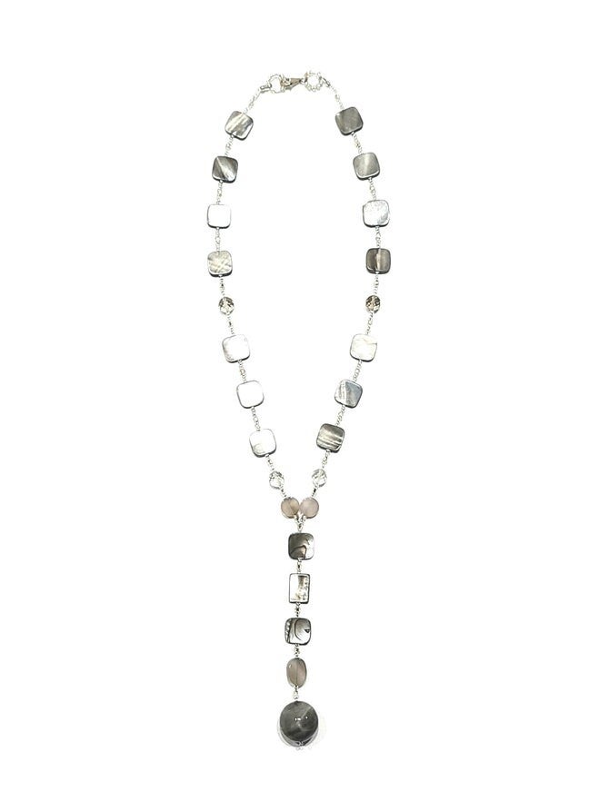 Material: Gemstone: Agate, quartz, jasper, mother pearl shell Glass: Rose gold tone glass beads, clear glass beads, Metal: 925 sterling silver clasp, findings