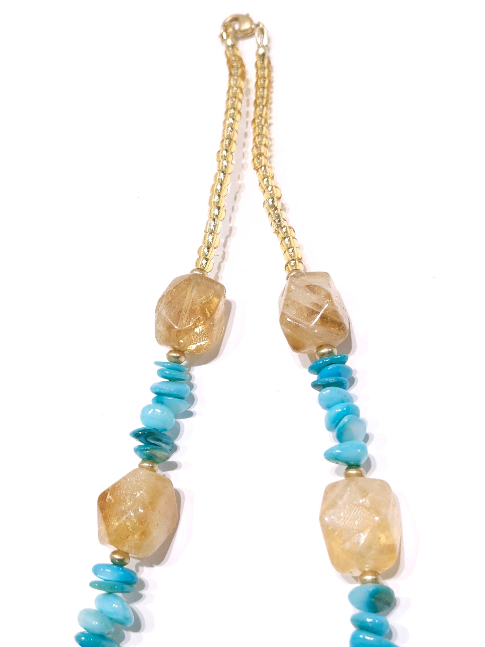 Material: Gemstone: Citrine, blue magnesite(enhanced), blue apatite, Glass: Honey tone beads, Metal: Clasp, earring closures, copper spacer beads(earring closure attachment), soft gold tone spacer beads, findings, wire wrapping, wire