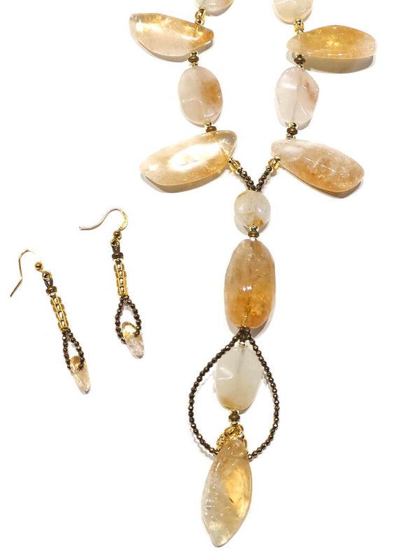 Material: Gemstone: Citrine, bronze tone hematite, gold tone hematite, Glass: Honey tone beads, Metal: Clasp, earring closures, findings, wire