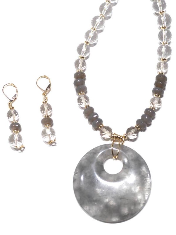 Material: Gemstone: Grey & clear agate go-go donut shaped medallion pendant, grey agate, clear quartz, Metal: Clasp, earring closures, spacer beads, findings, wire wrapping, wire