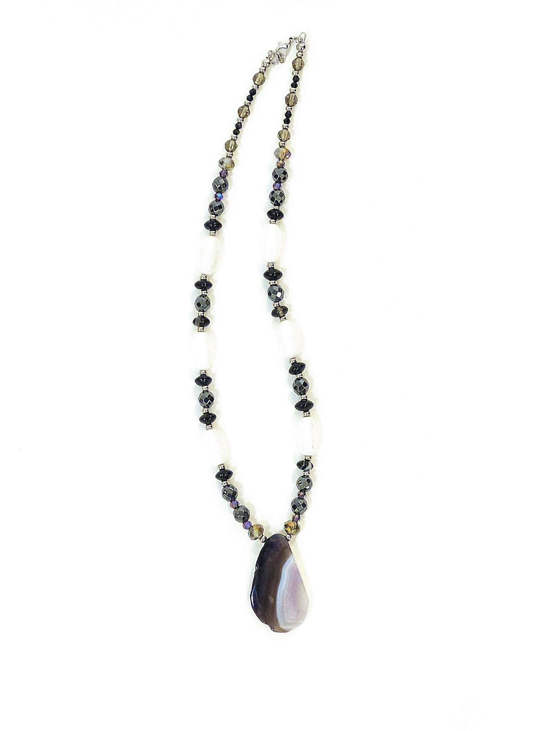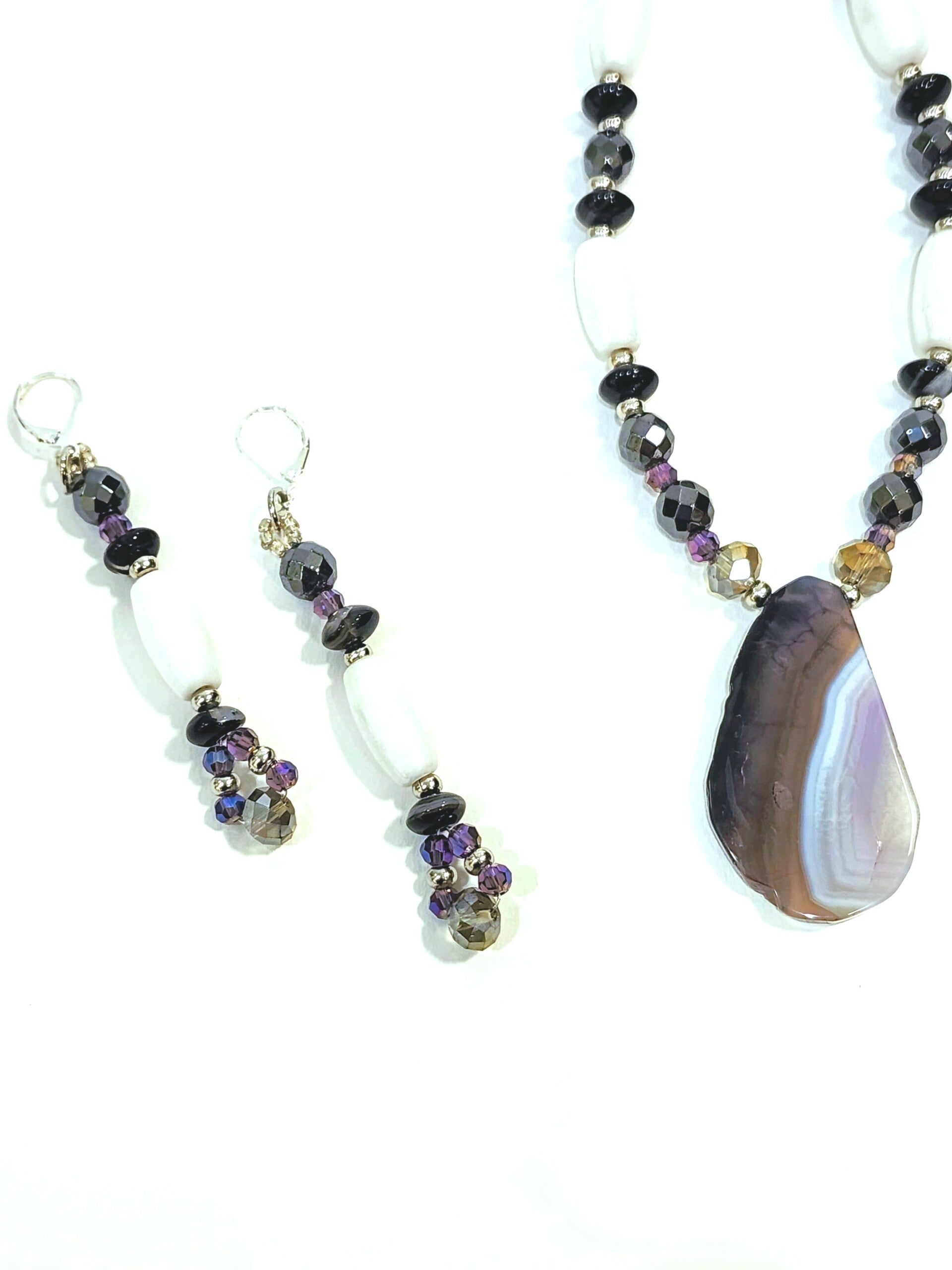 Material: Gemstone: Banded agate, spinel, hematite, multicolored agate pendant, Glass: white porcelain beads, multicolored iridescent beads, smokey taupe transparent beads, Metal: spacer beads metal, findings, leverback earring hooks