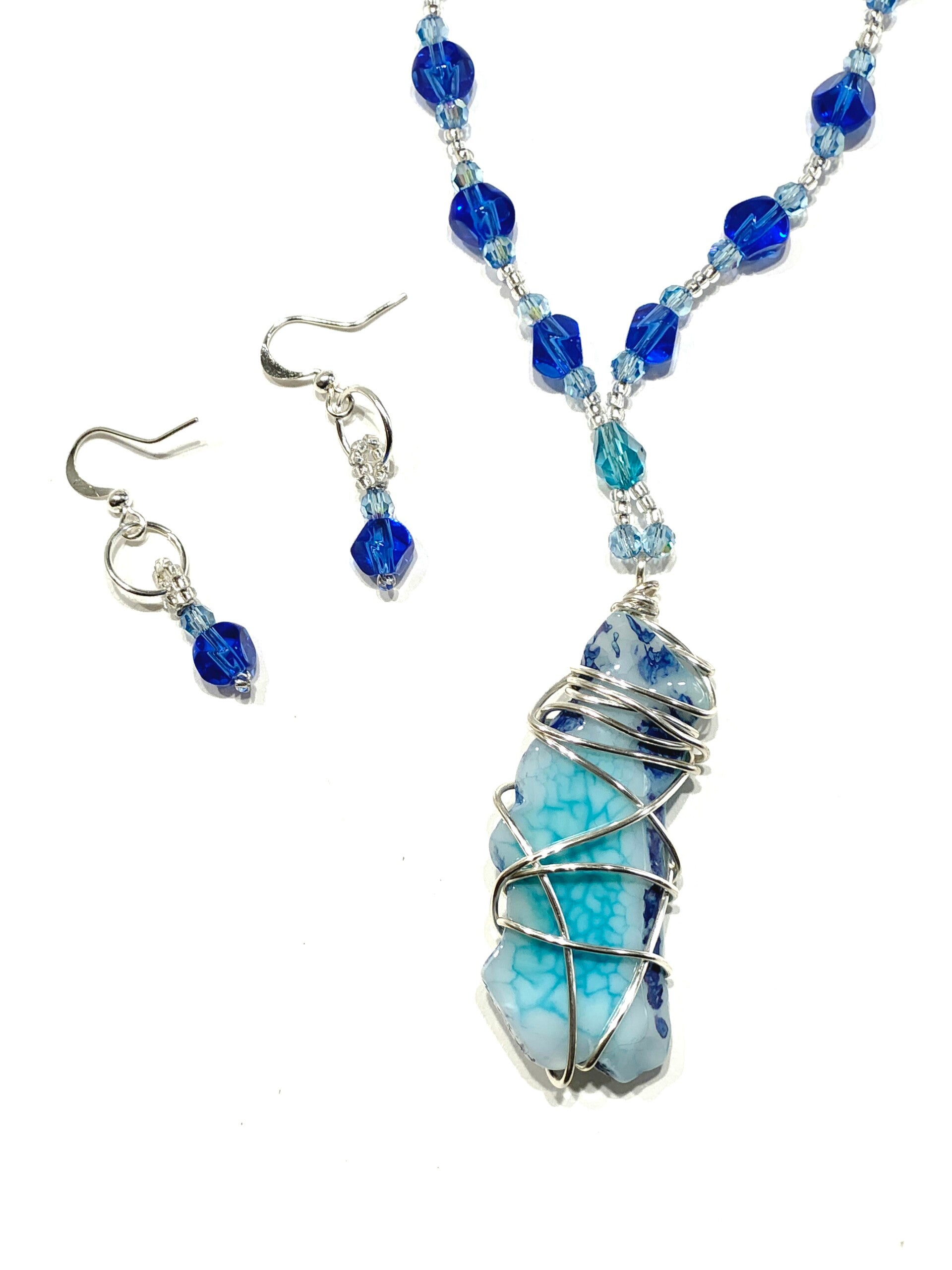 Material: Gemstone: Agate pendant, Glass: Blue & turquoise beads, clear spacer beads, Metal: Clasp, earring closures, findings, wire wrapping, wire