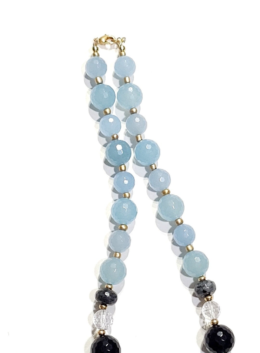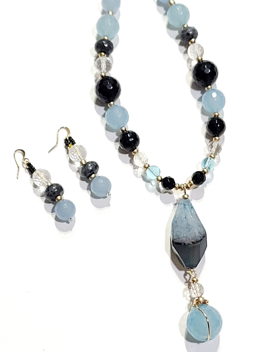 Material: Gemstone: Grey & blue agate pendant(enhanced), clear quartz, larvikite, black onyx, blue jade(enhanced), Glass: Soft gold tone spacer beads, blue translucent accent beads, black seed beads, Metal: Clasp, earring closures, soft gold tone spacer beads, findings, wire wrapping, wire