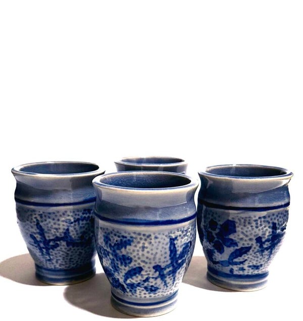 Set of 4 Vintage Glazed Blue Pottery Cups