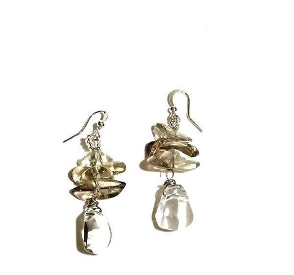 Material: Gemstone: Smokey quartz, clear quartz, Glass: Clear seed beads(closure attachment), Metal: Earring closures, findings, wire wrapping, wire