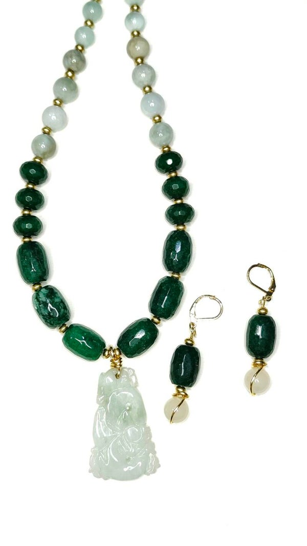 Material: Gemstone: Green jadeite carved pendant, green angelite, agate, verdite(enhanced) Metal: Clasp, earring closures, soft gold tone spacer beads, findings, wire wrapping, wire