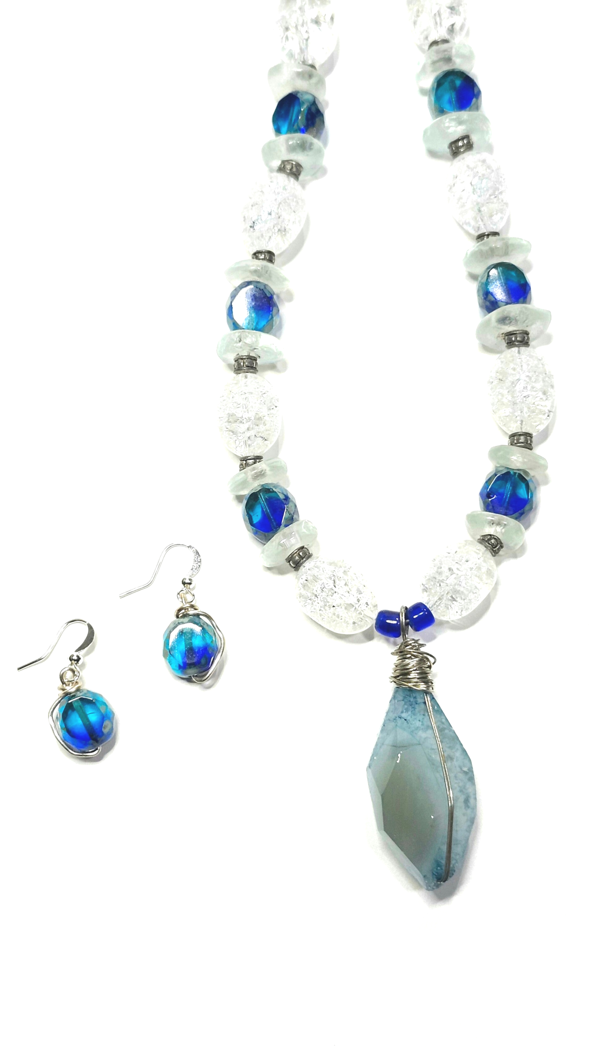 Material: Gemstone: Agate drop pendant, clear crackled quartz (oval shaped) Glass: African rondelle shape spacer beads, sapphire-Indigo-sky blue fire polish picasso table cut faceted czech beads, mini clear oval shaped beads, silver shimmer spacer beads, indigo spacer beads, sky blue spacer beads, Metal: Clasp, imprinted spacer beads, findings, wire wrapping, wire