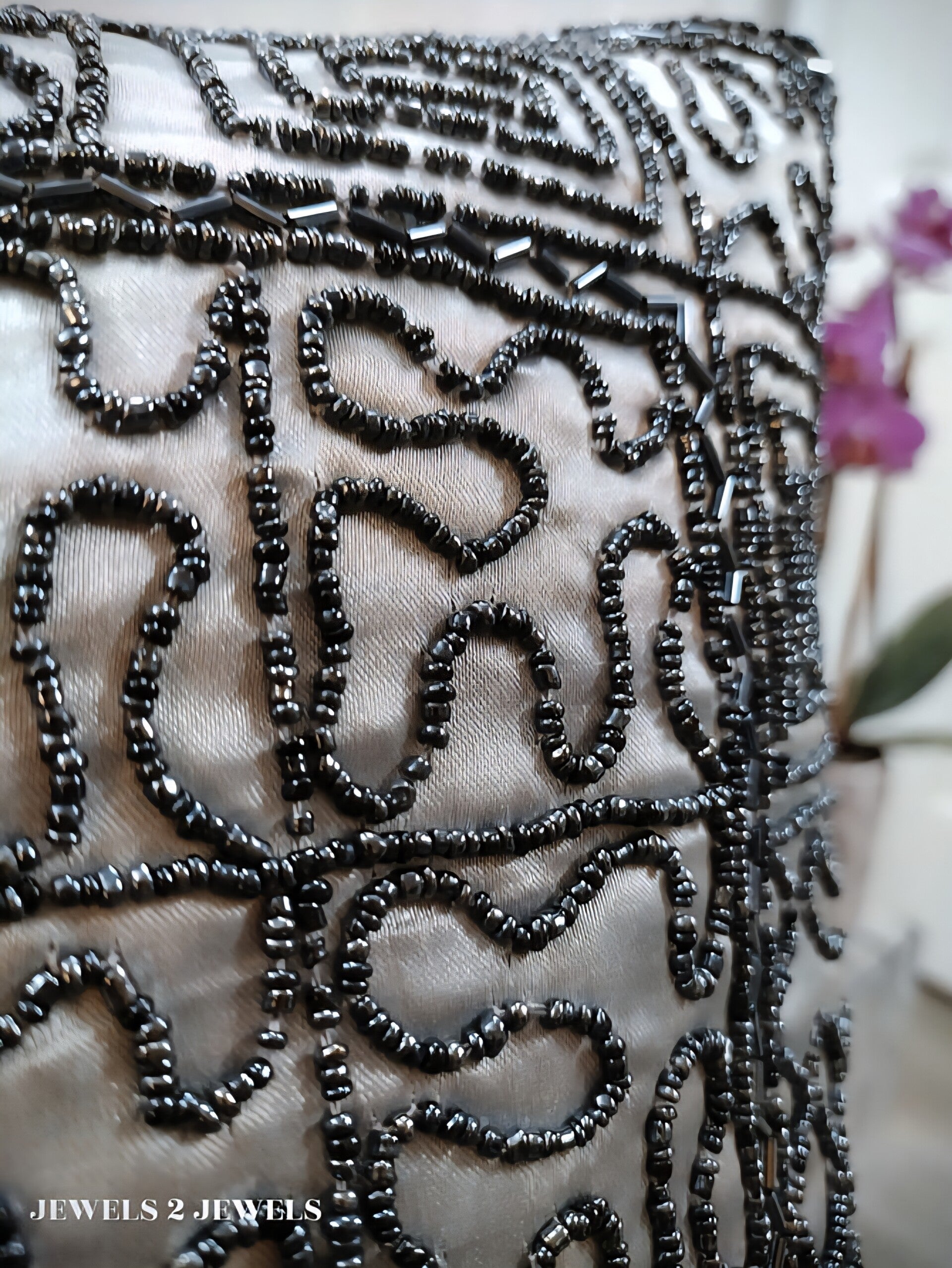 Material: Silver colored satin fabric, dark chrome gray acrylic beads and metal zipper