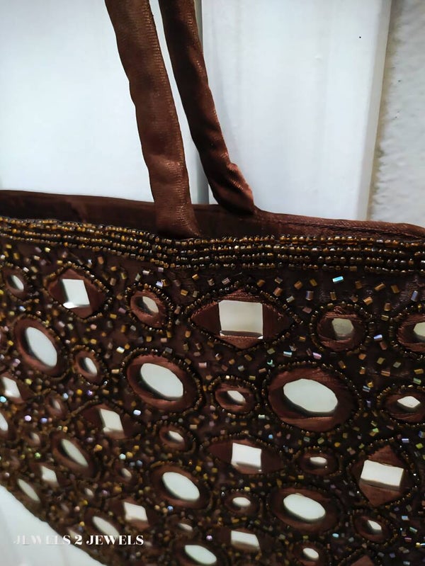 Material: Brown Satin fabric, geometrical shaped mirror pieces, and acrylic Multicolored beads, metal zipper